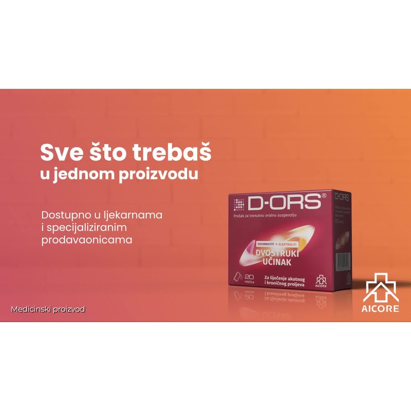 D-ORS® – sve što trebaš u jednom proizvodu. Zahvaljujući jedinstvenoj kombinaciji diosmektita i oralnih rehidracijskih soli, D-ORS® istovremeno štiti probavni sustav i nadoknađuje izgubljenu tekućinu